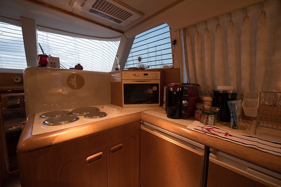 The boat has a spacious living room area and a kitchen. In the living room, you will find a saloon, a TV SMART 40″ – DVD, a Radio/CD player. The kitchen is fully equipped with water filter, freezer, ice-maker, coffee machine for espresso and cappuccino, a kettle, microwave and oven. At the front you will find sunbeds during the boat rental period.
